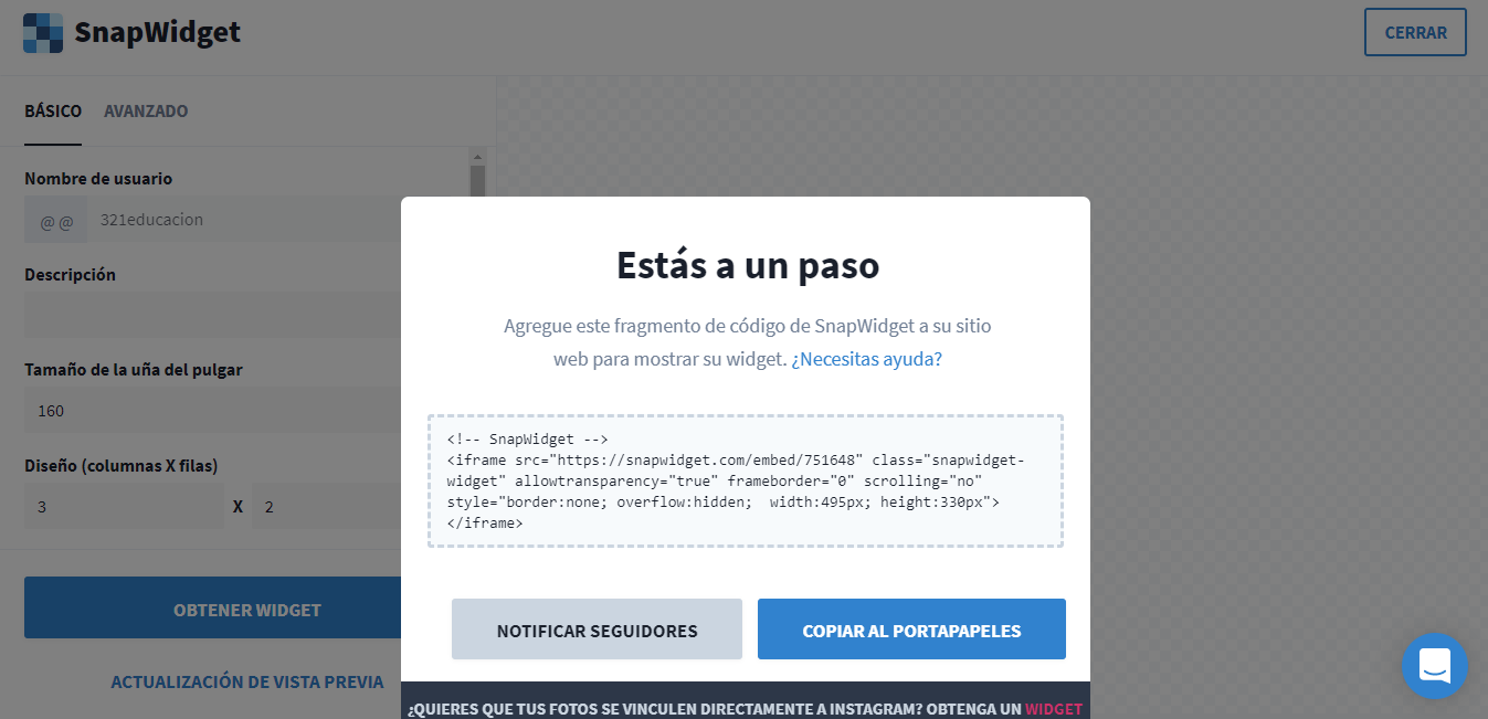 Aquí te presentamos la pagina que usamos, SnapWidget, esta pagina te permitirá obtener el html que debes introducir en tu pagina web. a continuación te presentamos los pasos que debes seguir: